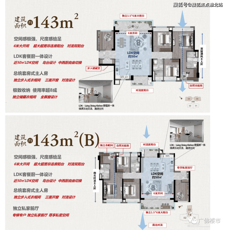 2,143㎡,有两个户型,都是6米大开间+南北对流双阳台+LDK岛台+主卧对流,很不错