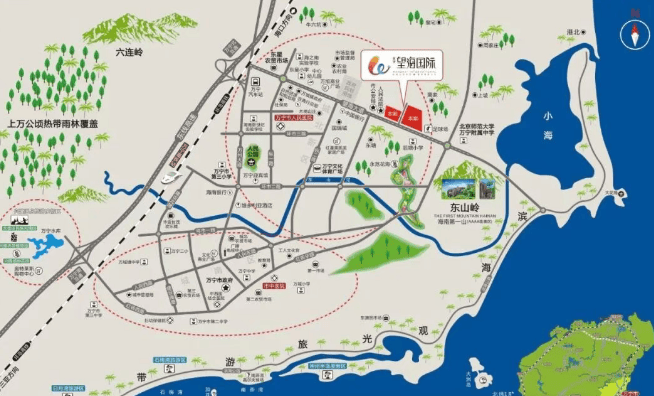 周边配套:周边有文化体育广场、大型综合商超、东星农贸市场等商业配套,还有万宁市人民医院(综合三甲),以及北师大附中、海之南实验学校等教育资源,交通便利,距离汽车站约 2.9 公里,高速路口约 3 公里,高铁站约 6 公里。