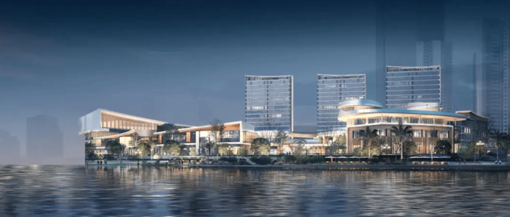 占地面积与建筑面积:占地面积约 12 万㎡,总建筑面积约 25 万㎡,其中住宅约 13 万㎡,欢乐海岸约 7.6 万㎡,大剧院约 4.4 万㎡。