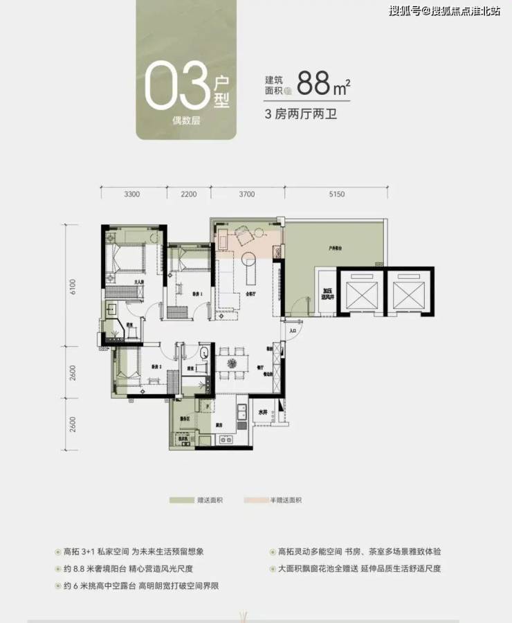 建面约88㎡偶数层三房,全江门最小面积的4.5代户型,赠送6米挑高露台。