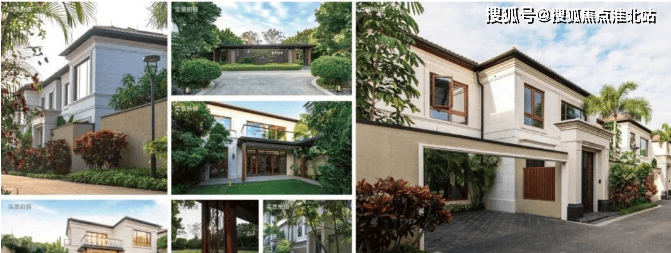 外观风格:别墅统一采用二层造型,墙面以仿石涂料为主,突出的门头位置采用葡米石材,主体以均衡的虚实比例及考究的细部线条营造价值感。屋顶采用仿柚木铝合金的深远挑檐及平坡结合的方式,打造热带风情和度假氛围。
