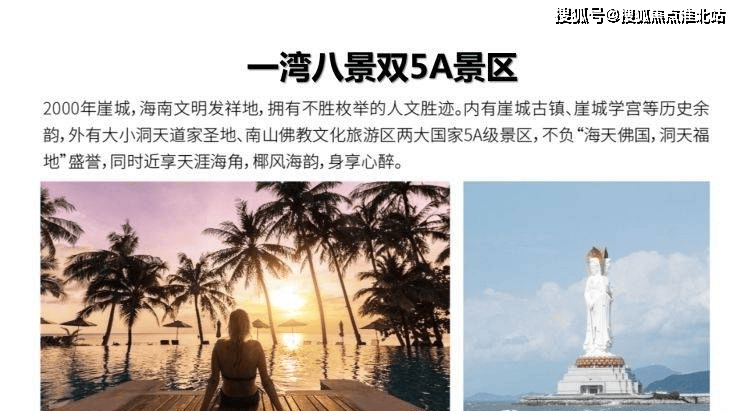 周边还有多个旅游景点:南山寺(距项目8公里)和大小洞天(距项目6公里),兰花主题公园、南天门生态大观园、崖州古城等。崖城老城区是华夏有名的长寿之乡,这里现有已统计的百岁老人有100多位,同时崖城还是海南首个历史文化名镇,保留了诸多的历史古迹,如古城墙、孔子书院、迎旺塔等。