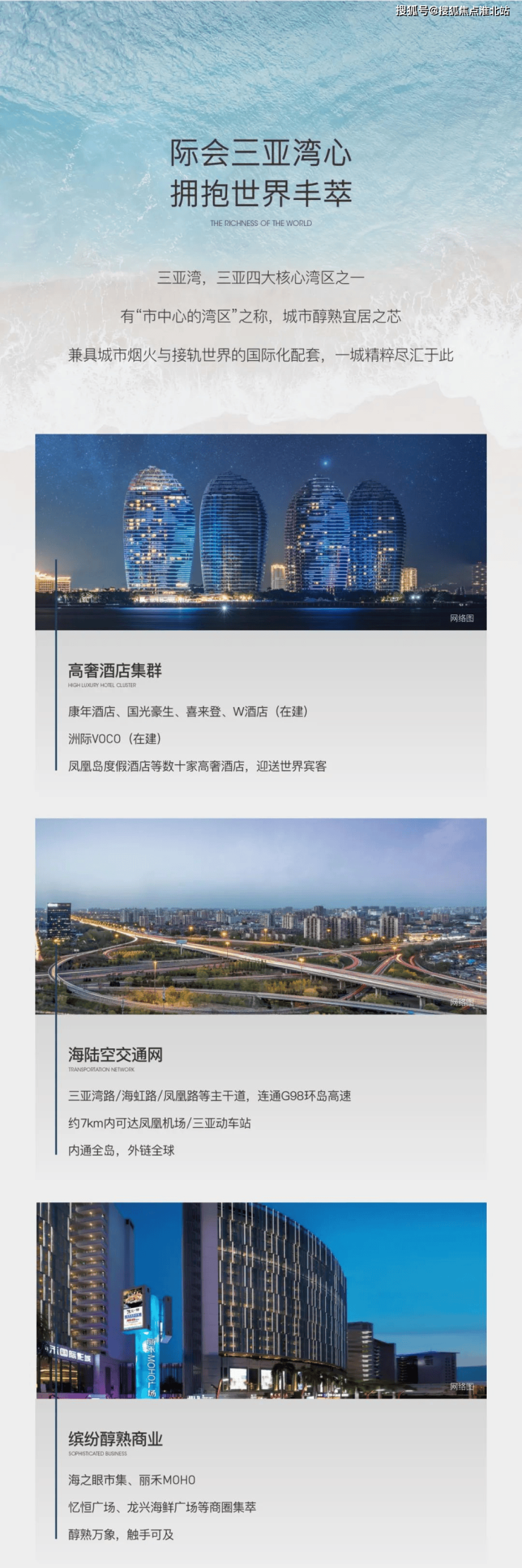 三亚湾路、海虹路、凤凰路等主干道纵横交错,无缝连通 G98 环岛高速,约 7km 内可快速抵达凤凰机场和三亚动车站,构建起内通全岛、外链全球的便捷交通体系。