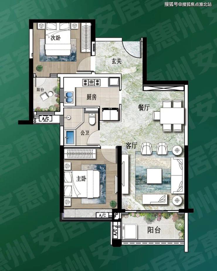 但缺点在于:方正性不足,只做到了两室,利用率低。大多数面积耗费在了生活阳台与玄关处,承重墙与厨卫完全限制了改造可能。这对于刚需偏改善客户来说会较为不利。