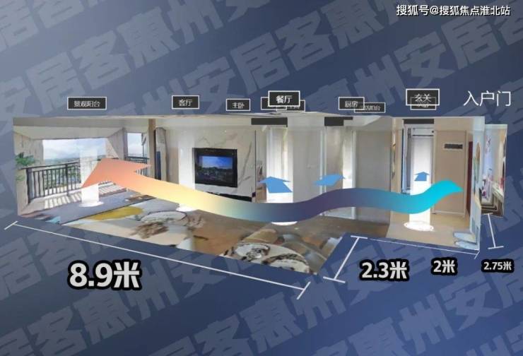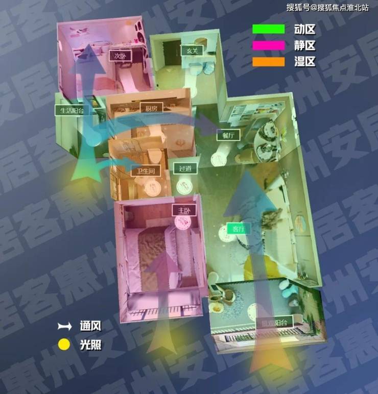 据示意图可知,从采光上分析,由于双阳台与户型楼栋无遮挡特性,厅室光照表现较为优秀,而玄关处则较为阴暗,需要加装大功率灯具。湿区较为集中,易于清理。4平米的公卫虽小,在样板间也做到了干湿分离。