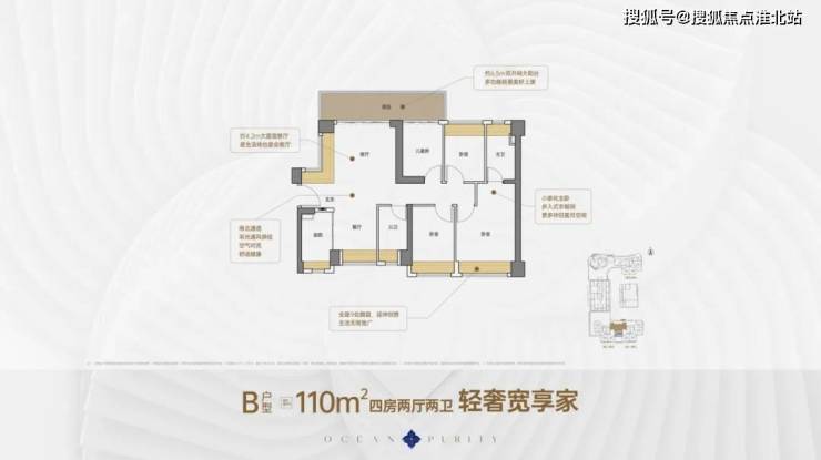 建筑面积约110㎡的4房2厅2卫,南北通透,约4.2米大面宽客厅,约6.5米长的大阳台,主卧套间设计,全屋9处飘窗,拓展生活无限可能。