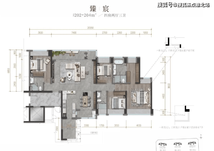202-204㎡四房两厅三卫:南北通透横厅设计,7.4 米超大阳台直面科学公园,双套房配置,主卧面积达 33㎡,次卧分别为 16.1㎡、13.54㎡、11.61㎡,L 型厨房附带生活阳台,主卫及次卫均采用干湿分离设计,预留个性化改造空间,东北或西北向。