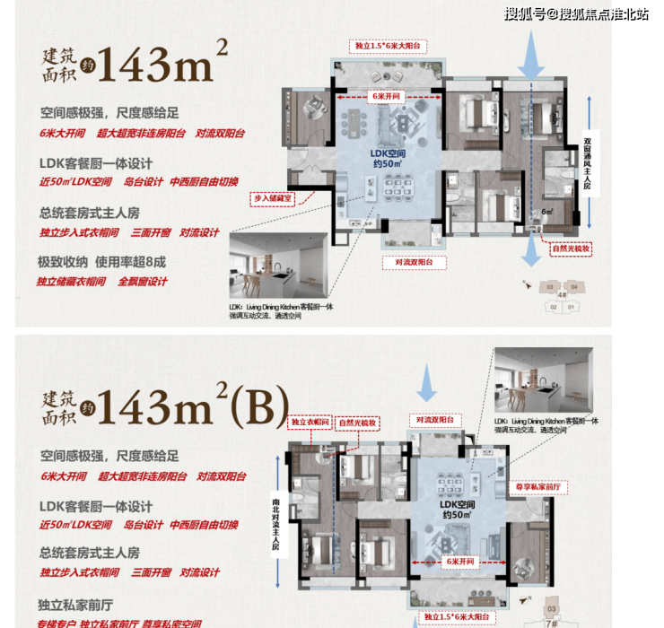 2,143㎡,有两个户型,都是6米大开间+南北对流双阳台+LDK岛台+主卧对流,很不错