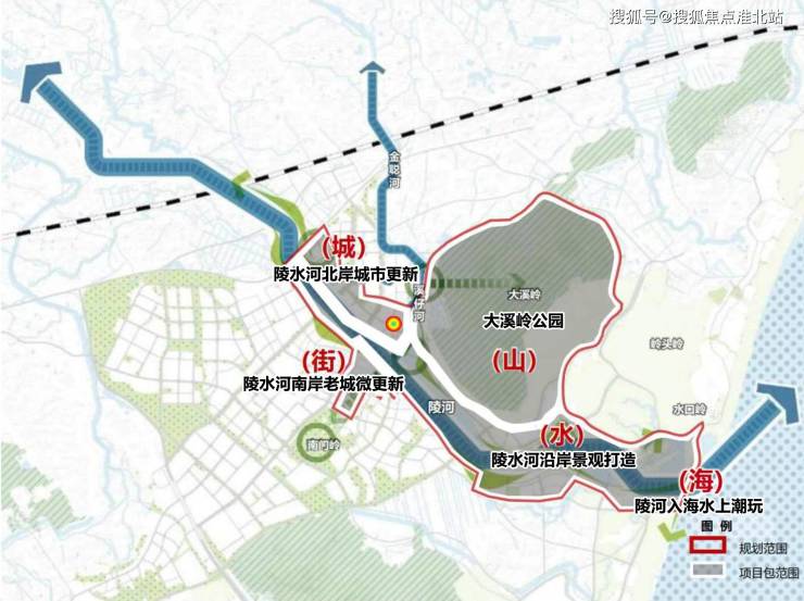 项目规划总面积约11.4平方公里,包括大溪岭公园(山)、陵河沿岸景观打造(水)、陵水河南岸老城微更新(街)、陵水河北岸城市更新(城)、陵河入海水上潮玩(海)五个子项目,整体项目依托陵水河开发,拟分为一期首开区、一期次开区、二期、三期四个阶段,傍山邻水望海瞰街,形成以美好栖居、商业服务、产业办公为主,集“山、水、街、城、海”功能规划于一体的滨水理想新城中心。