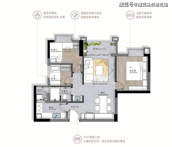 户型:主力户型为 77-80-88-97-100 平方米的三房,121 平方米的四房,户型方正实用。