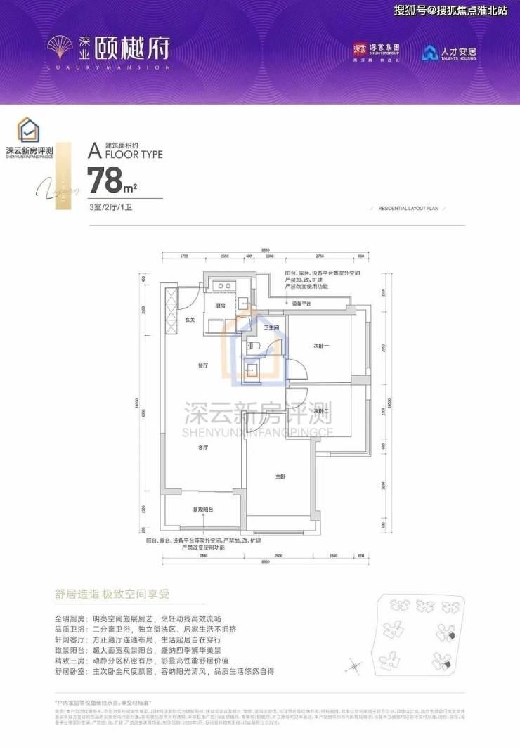 「深业颐樾府」整个项目包含4栋住宅 + 3栋保障房,带一个幼儿园,车位共1400个。其中住宅楼为32-45-46F高层和超高层建筑,本次只推售5栋,为46F超高层3梯6户。