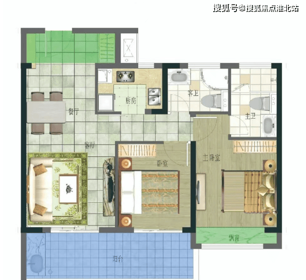 约 80-90㎡两室两厅一卫:紧凑实用户型,客厅连接南向阳台,采光较好;两个卧室面积适中,满足小家庭基本居住需求;厨房和卫生间布局合理,空间利用率高,适合刚需购房者或投资出租。