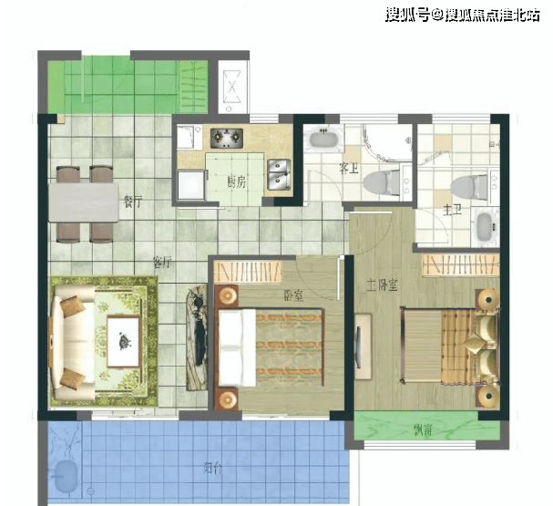 约 80-90㎡两室两厅一卫:紧凑实用户型,客厅连接南向阳台,采光较好;两个卧室面积适中,满足小家庭基本居住需求;厨房和卫生间布局合理,空间利用率高,适合刚需购房者或投资出租。