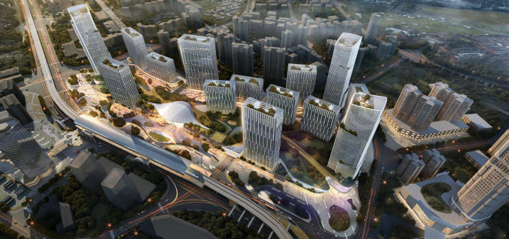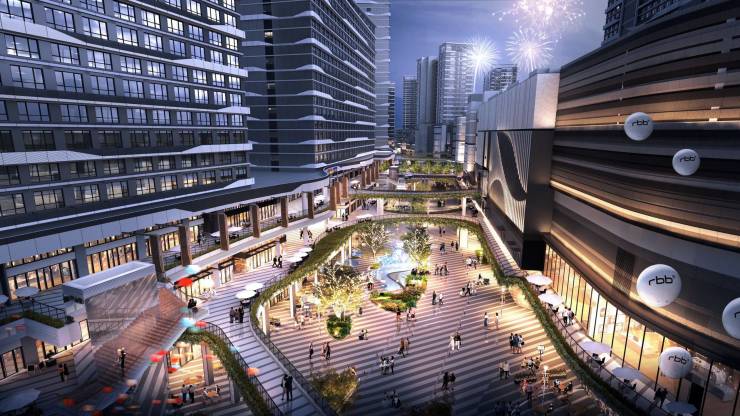 业态分区:西地块(空中商铺为主,多已售罄);东地块(高层办公 + 空中商铺);中地块为自持天街与 1# 地标写字楼。