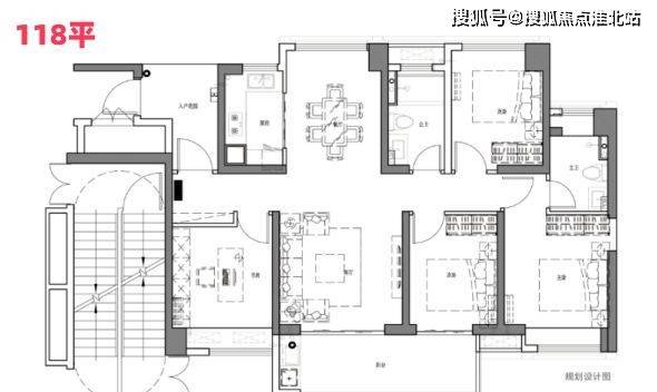 建面118㎡:南北对流四房单位,阳台宽达5.5米,连接次卧,整体空间感更佳,南向可欣赏到江景及奇槎体育中心,尽管可能会受到一些噪音影响。