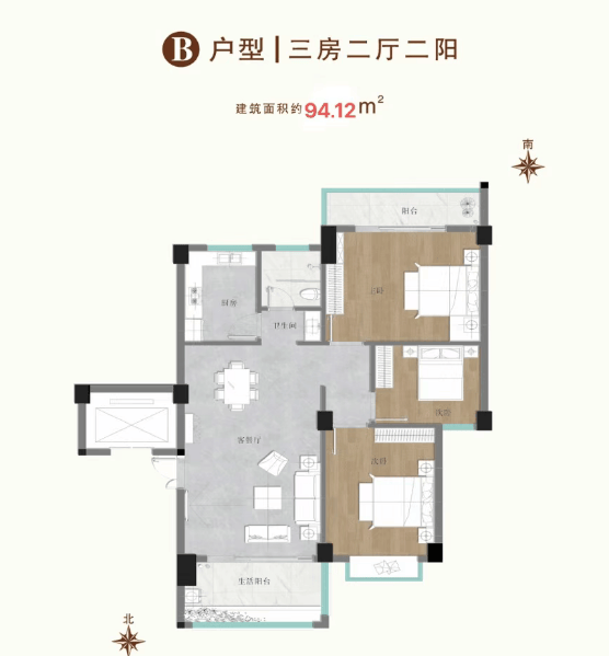 户型信息:在售户型有 94.12㎡三房两厅一卫、105.45㎡三房两厅两卫,户型方正,南北通透,明厨明卫,大阳台设计,横厅开阔,景观视野好。