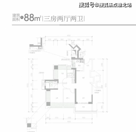 88㎡三房两厅两卫:与 85㎡户型布局相似,客厅同样 3.4 米开间,3 个卧室宽度分别为 3.55 米、2.6 米、2.4 米,U 型厨房,公卫三段式分离设计,得房率约 95%,阳台进深 1.8 米,有西南或东南朝向。