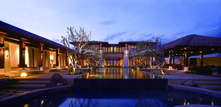 建筑风格:融合中国商周 / 战国文化元素,采用海南火山岩等本土耐候材料;单层为主,户户通透,保证观海面与庭院私密性;园林为 40 万㎡热带生态园林,水系与植被交错。