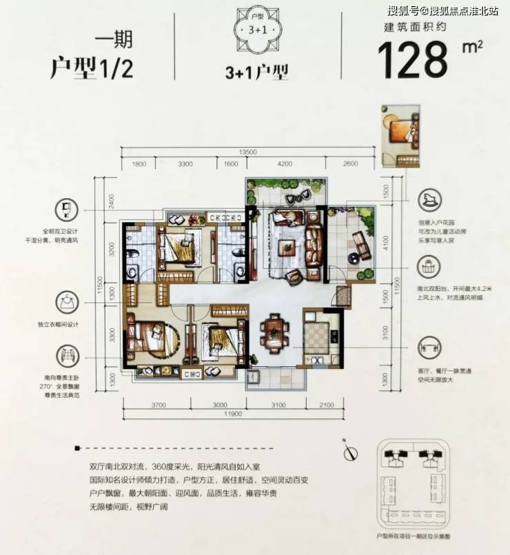 建面128㎡的四房对应的是1户型和2户型,双阳台设计保证了采光和通风,朝向都做到南北通透,这样居住起来是比较舒适的。
