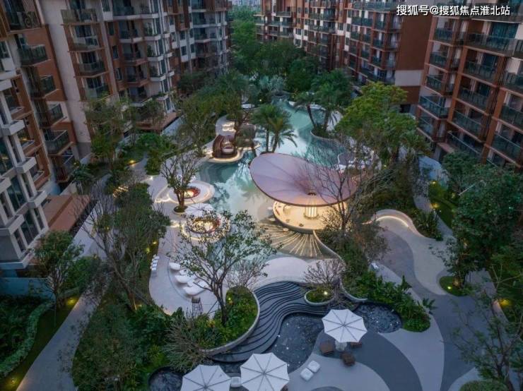景观以强烈的地域符号,流动的设计手法展现了热带花园的自然感,以整体概念“漂浮的绿洲”引水入城,营造热带花园社区。