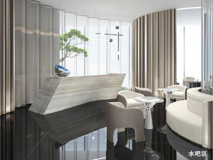 灵动的线条——曲线作为线索贯穿整个商业中心。圈圈圆圆的洽谈分区如同雨水滴落在宁静的湖面上所形成的涟漪。各个洽谈分区旁小草嬉戏、大树摇曳、春风迎面吹来,充满着绿意,如同上帝不经意留下的绝美手笔。白天鹅在湖面上愉悦地旋转跳舞,在它踮脚跳跃的一瞬间转化成商业中心天花上泛着水晶光芒的装置……