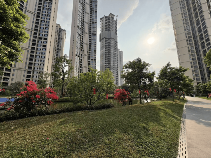 项目最大的卖点在于“半山”生态资源。小区三面环山,与80万㎡香雪公园仅一路之隔。香雪公园是广州“羊城八景”之一,以万亩梅花闻名,业主可私享天然的晨跑、露营氧吧。社区内部通过“台地式”抬高约9米的设计,实现了视野的通透与私密性的兼顾,真正做到“出则繁华,入则宁静”。
