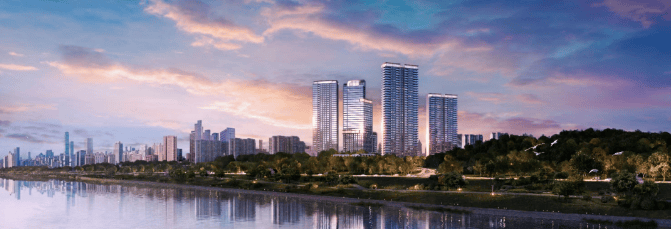 整体布局:东西横向看,四栋楼排开,均处于公园天际线、湘江天际线当中;南北纵向看,可越过山、瞭望江,看到靳江河入江口以及河西繁荣大城;从上下立体空间看,和江山最高点约 190.65 米,是区域制高点。