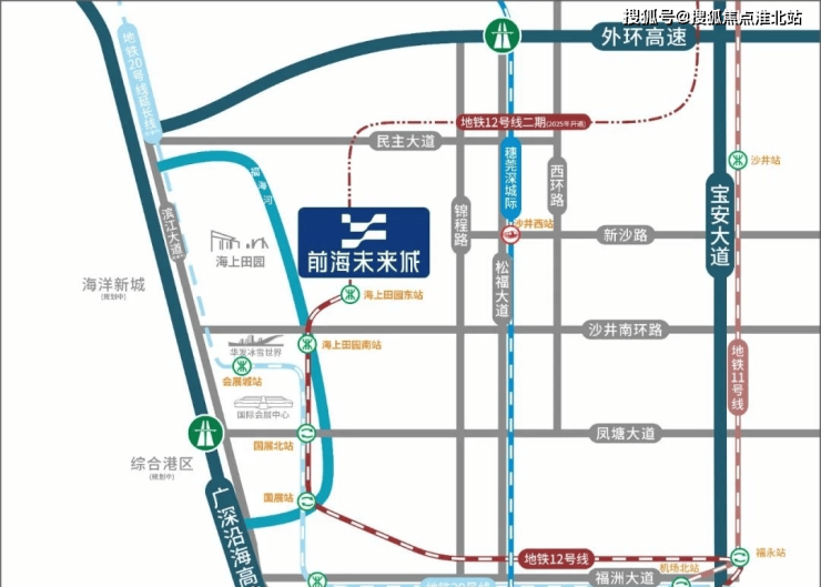 蔚蓝海尚位于整个项目的东北角,地块呈梯形,家门口就是12号地铁线“海上田园东站”,一期是最靠近地铁站的,2站到国展北站可以换乘20号线,6站到福永站还可以换乘11号线,快速通达宝中,南山区。