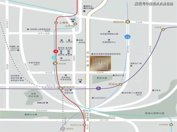 地铁:4、6号线,红山站约1.3公里。1站直达深圳北站。4站到福田。5号线,民治站约1.4公里。22号线(规划中)四轨交汇环绕。