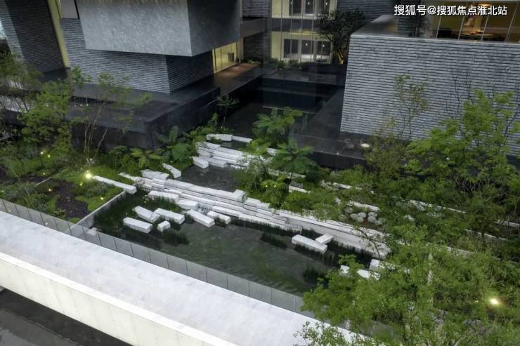 建筑的极简立面手法与自然艺术的景观手法高度融合,整体呈现出现代主义的设计风格,于高楼林立间营造区域生活绿心。建筑体量根据不同功能从上至下进行划分,首二层建筑形体进退错落,平台层层叠叠,如击碎的山石散落于前场景观间,与三层69米宽的完整建筑体量形成对比。中心空间被打开形成中庭,并引入瀑布,瀑布与景观溪流紧密结合扩散全局。