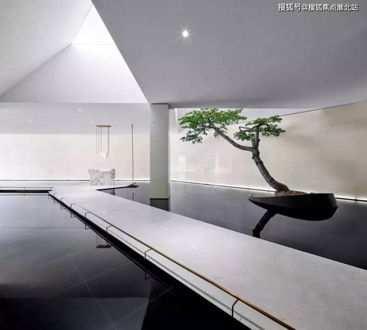 楼梯旋转,从空灵的美术馆转入丰饶的洽谈空间。水池中央,黑色石材的建筑感雕塑,国画皴法概念暗含其中,衍生出未来的诗意。