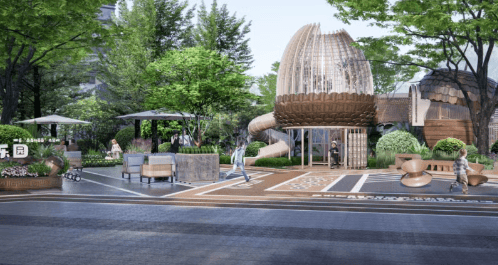 园林设计:西区以顺德清晖园为蓝本,融合岭南园林元素,打造全龄功能场地与主题架空层。