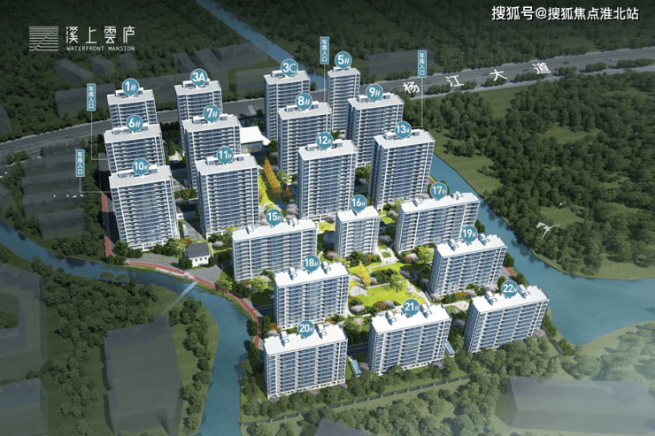 建筑布局:项目共 20 栋建筑,采用北高南低排布,北区规划 12 栋 17 层小高层,南区规划 8 栋 11 层洋房,一揽水岸风光与树人大学风景。