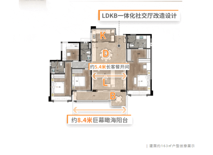 LDK一体化设计,打通玄关、客厅、餐厅、厨房,形成超大家庭欢聚厅,加上南北对流设计,让空间充满生命力。