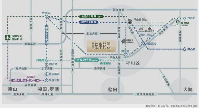 地铁14号线深圳东部首条地铁快线, 4站大运、12站福田岗厦北。地铁16号线深圳东部组团线路,快速联通龙岗、坪山。