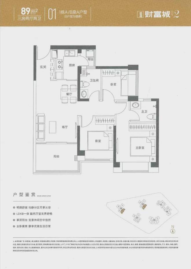 89㎡的3房2厅2卫,设计的是经典竖厅格局,客厅3.29米开间,3个卧室分别是3.3/2.8/2.5米的宽度,L型厨房,带1个小生活阳台,得房率约:76%(不含赠送),西南、东南及东北朝向。