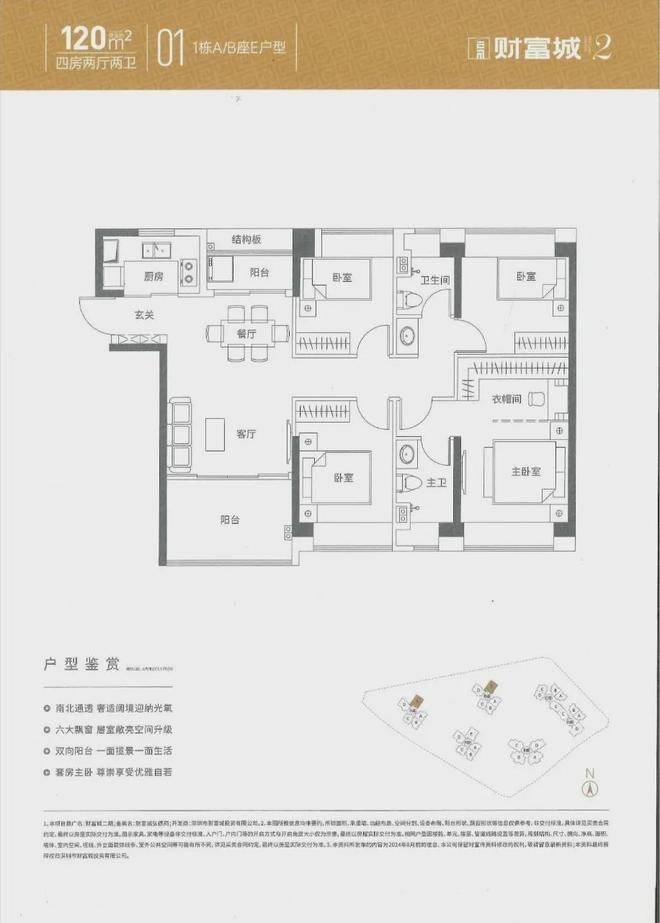 120㎡的4房2厅2卫,设计的是竖厅南北通透格局,双阳台设计,客厅3.6米开间,4个卧室分别是3.2/3.2/2.75/2.75米的宽度,U型厨房,得房率约:76%(不含赠送),阳台主朝东南、西北、东北向。