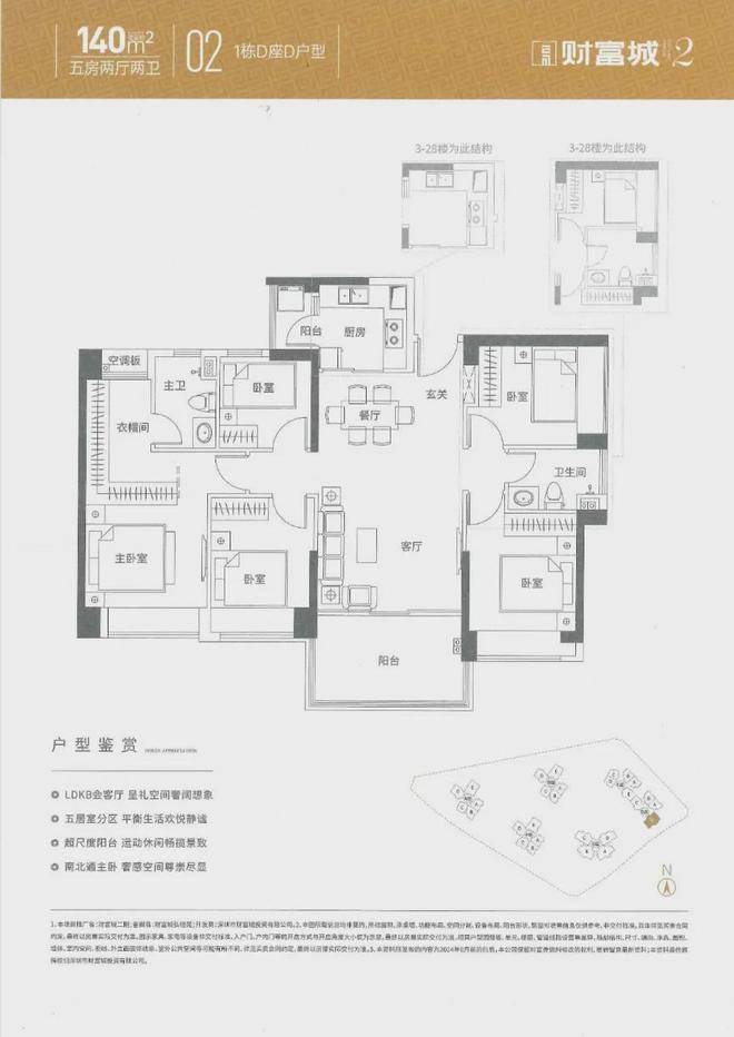 140㎡的5房2厅2卫,设计的是竖厅双龙抱珠格局,客厅4米开间,四开间朝南,4个卧室分别是3.55/2.95/2.95/2.7米的宽度,L型厨房,带1个小生活阳台,得房率约:76%(不含赠送),西南、东南朝向。