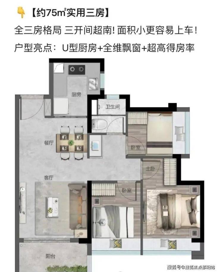 户型亮点:U型厨房+全维飘窗+超高得房率