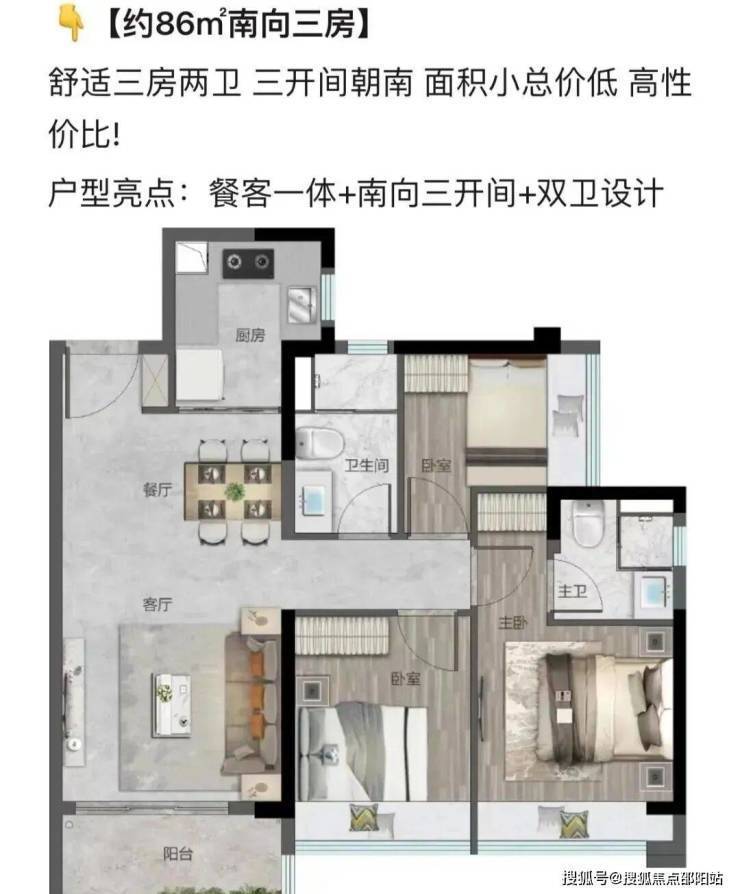 在售户型:75平3房两厅1卫,。86平3房两厅两卫,101平4房两厅两卫