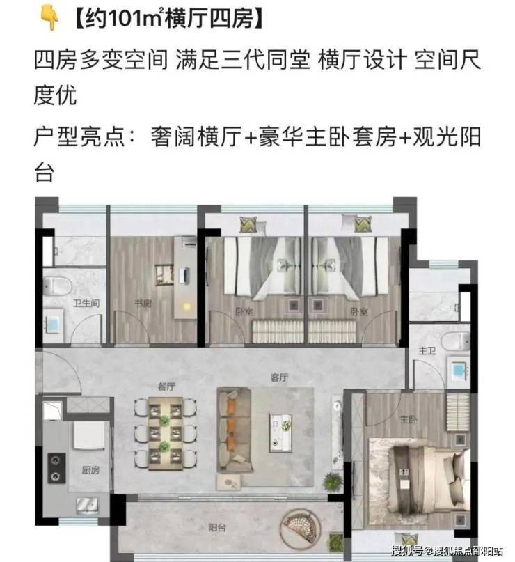 户型亮点:奢阔横厅+豪华主卧套房+观光阳台