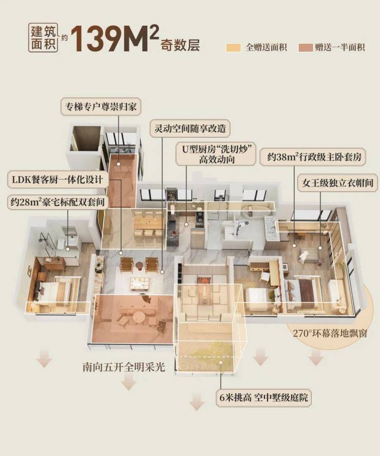 令人震撼的是,奇数层及偶数层,皆带有全屋五开间采光朝南、LDKB+X灵动空间+空中墅级庭院