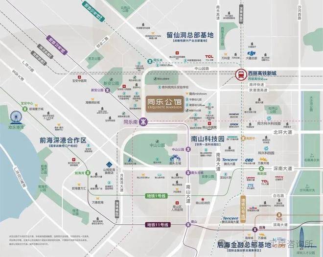 看下图,同乐公馆东面是南山科技园,西面是前海,南面是后海、深圳湾,北面是西丽留仙洞。