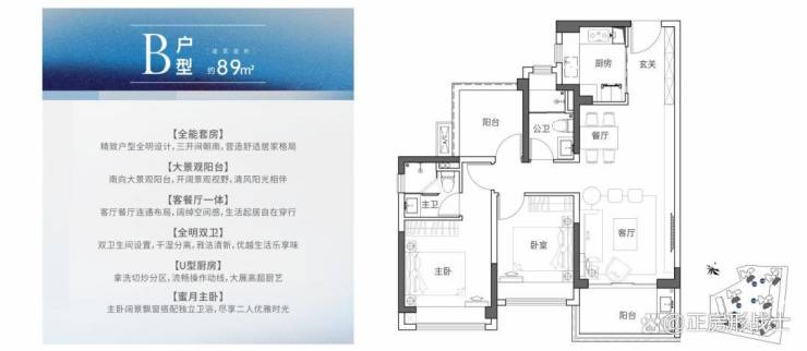约89㎡:3房2厅2卫,总价约82万,双卫设计更便捷;
