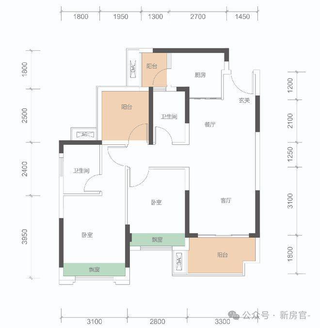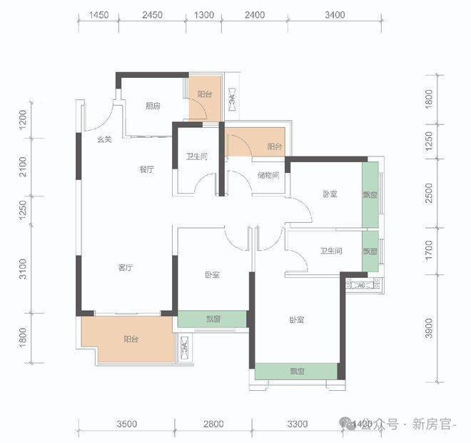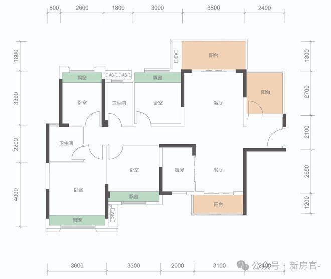 B户型: 100㎡(3+1房,2卫)同级面积稀缺3+1房、稀缺三开间朝南,总价约108万。