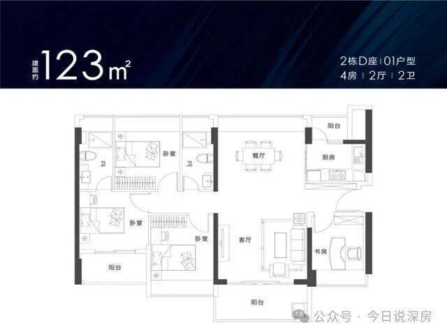 123㎡的4房2厅2卫,设计的竖厅南北通透格局,客厅主卧双阳台设计,厨房也带小阳台,客厅朝西南向,高层可享受双面景观。