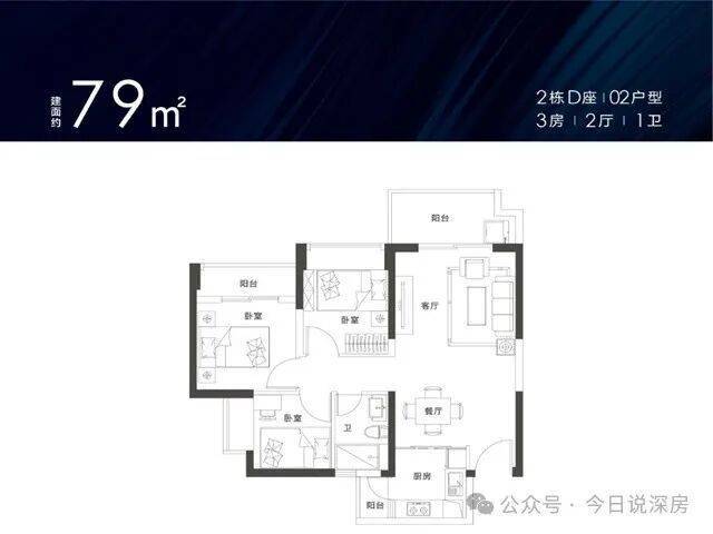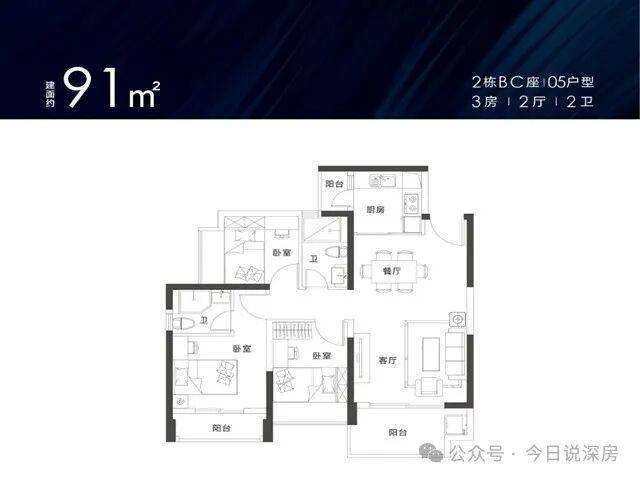 91㎡的3房2厅2卫,设计的经典竖厅格局,客厅主卧双阳台设计,厨房也带小阳台,三开间朝南,客厅朝西南向,有1个2栋D座03户型非常类似,客厅朝东北向