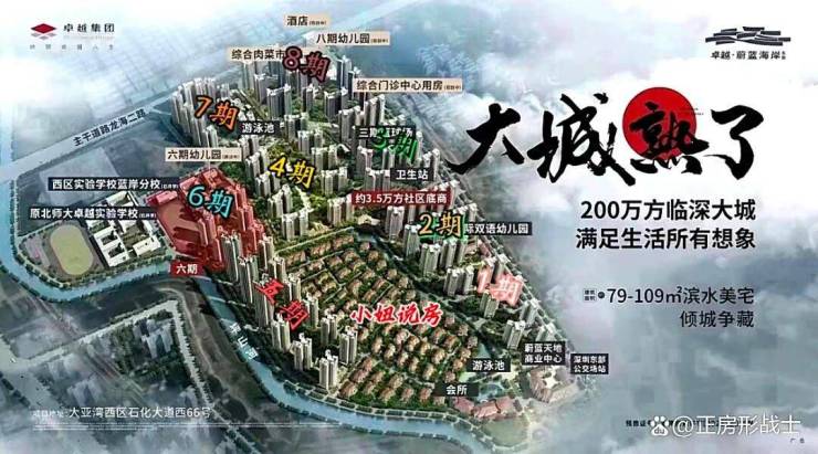 【基盘信息:十年大城,成熟可期】项目位置:惠州大亚湾西区石化大道西66号(临深直线约3km)总占地面积:约77.8万㎡总建筑面积:约200万㎡分期开发:共分8期,1-5期及7-8期已交付,6期在售在售组团:6期(69-72栋,70栋为主力)总户数(六期):1040户容积率:1.87车位比:1:1.035物业公司:卓越物业物业费用:2.8元/㎡·月交付时间:2025年12月产品类型:约79-109㎡精装高层价格区间:约8800-10500元/㎡