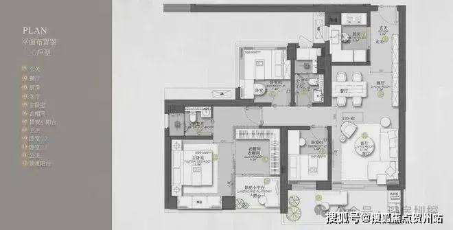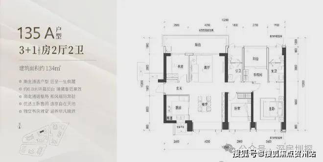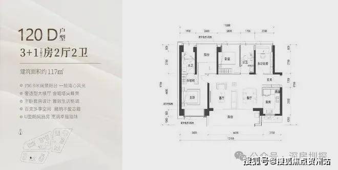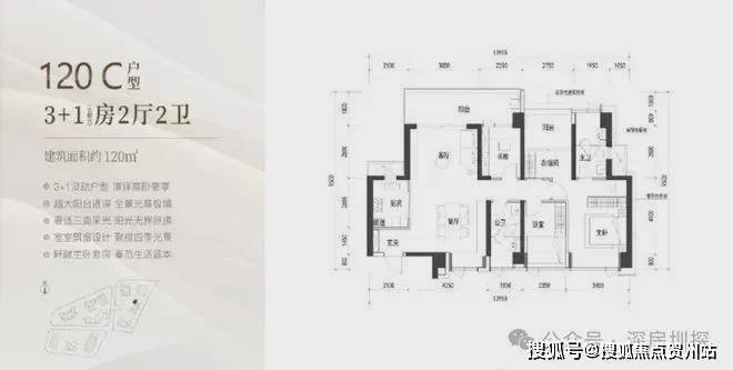 户型为大三房两厅两卫,东南朝向,含赠送半,阳台和飘窗等平台部分后使用率可达约 88%左右,这在超高层中是非常高的使用率。其中主客卧、客厅、双阳台合计开间超 12m,大尺度四面宽朝南,带约 6.15 米奢阔观景台,堪比一线豪宅的观景尺度;主卧超奢阔大套房,且预留了室内后期业主自行改造的灵动空间。
