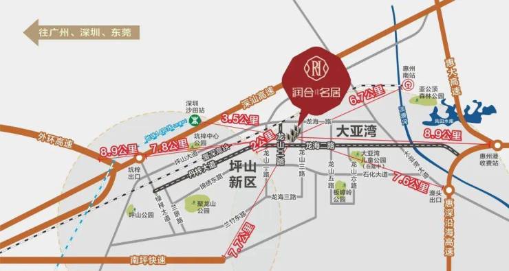 高铁出行:一站深圳两站香港厦深高铁(距项目9km, 一站抵深, 惠州南站-深圳北站仅需28分钟)